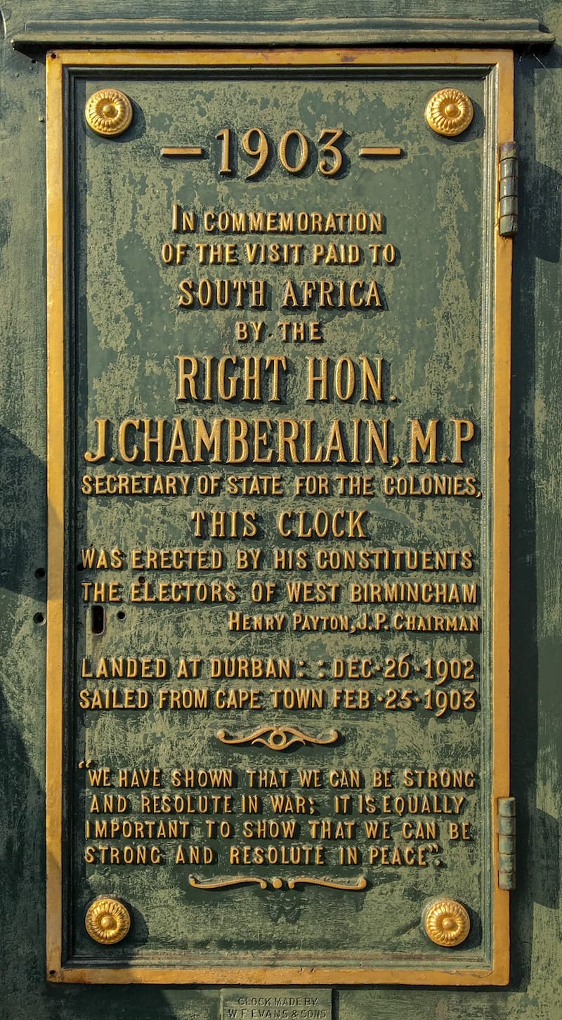 The plaque on the clock is about a two month tour of South Africa from over the Winter of 1902-3, a bridge building, conciliation effort to bring everyone back under the umbrella of the British Empire. Everyone with white skin, that is. Apartheid might not have become official policy until 1948 but it was there in all but name. Blacks were a resource, like the land, and the Boer Wars were effectively about who would control that resource.