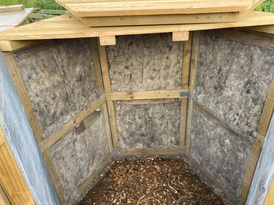 Secondly I created a void between the mesh and the slats which I ‘insulated’ with sheep wool. (This is commonly used as a packing material for chilled foodstuffs and I have a couple of sources, though you can also buy it as a garden mulch layer) I’ve found that wooden walls don’t allow air in and eventually rot, but mesh walls keep the first few centimetres of the heaps bone dry. I wanted to see if by replacing the edges with wool it would stay relatively dry while the stuff I wanted to compost would get on with it.