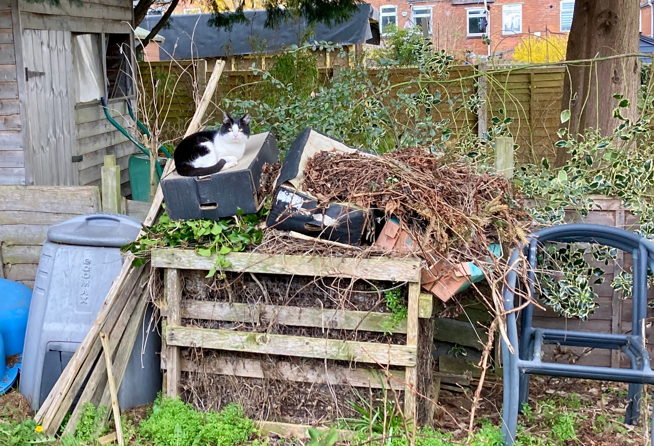 Scroll down for a cat on a compost heap