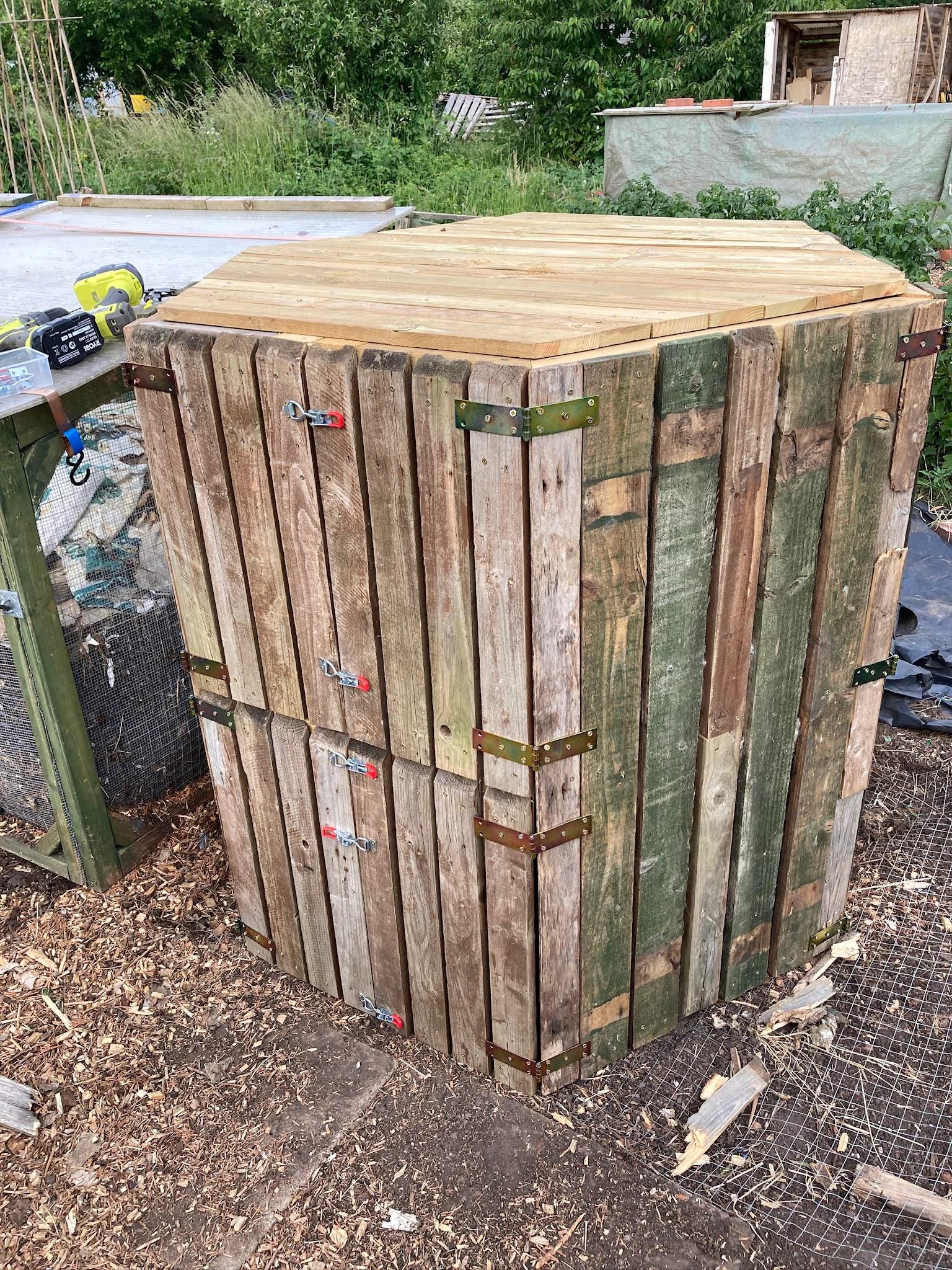 Last time I’d filled the current receiving pile to the brim so it’s now formally resting for the next couple of months. This means I now have three full bays and a significant amount of material with nowhere to put it. What I should do is empty the bay with the oldest heap of presumably finished compost, but I forgot my drill – another reason to put latches on those original bays. One day I’ll re-do my own composting system with everything I’ve learned from making them for other people. But not today.