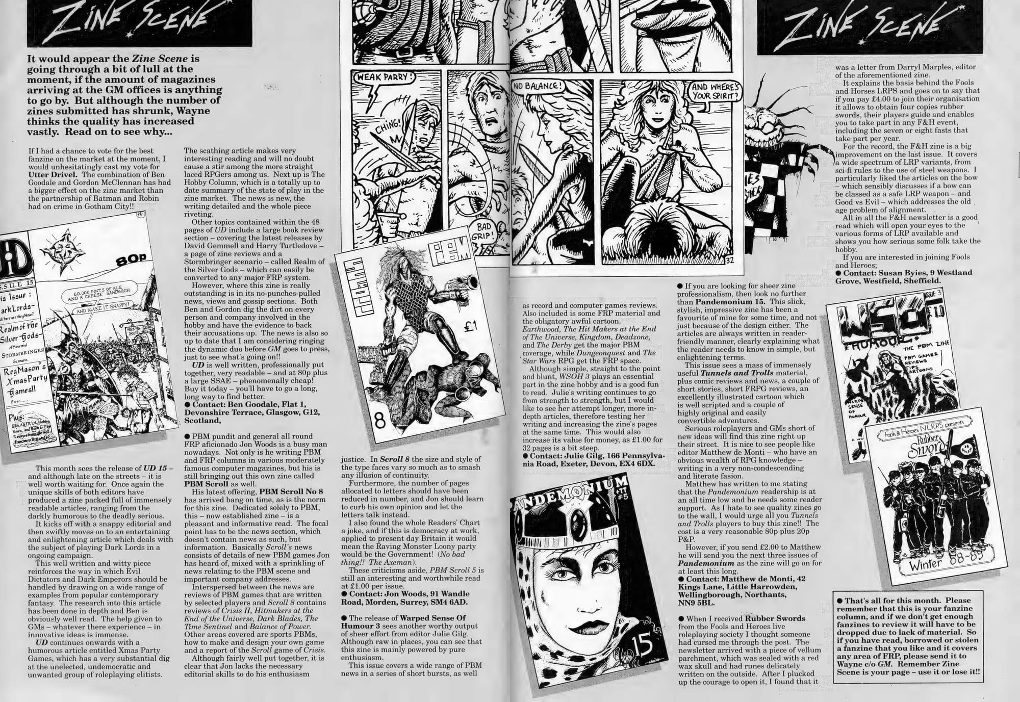 I am 14 going on 15 and my friend Phil is into fantasy roleplaying. I'm more into comics but there's enough of an overlap so he gets a bit into comics while I join him at the West Wickham gaming club. Phil is buying GM Magazine which has a couple of pages of zine reviews. I'm intrigued by the concept and send off for a few. Vollmond was a classic zine with all the requisite features, while Fat Knite had more comics and appealed to my juvenile sense of humour. There were others but what I saw in those two probably influenced the direction my life would take more than any other piece of media. (Issue 7 of GM is on Internet Archive. It's not the specific issue that changed my life but it has a zine reviews page.)