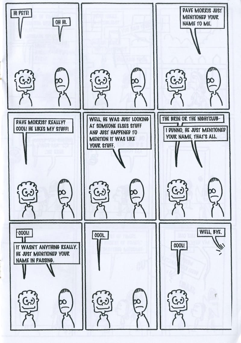 - I become quite good an introducing people to other people at events, further cementing the usefulness of my node on the network. I soon realised however that this was mostly because I was uncomfortable talking to new people, and introducing them to someone else was the fastest way to get out of that situation. Thankfully this was mostly beneficial for the people I didn't want to talk to as it got them in touch with new people, who did want to talk to them. But it was also sometimes a bit weird and awkward, as shown in this self-deprecating diary comic from Tim Brown's Part Time Lights 24.