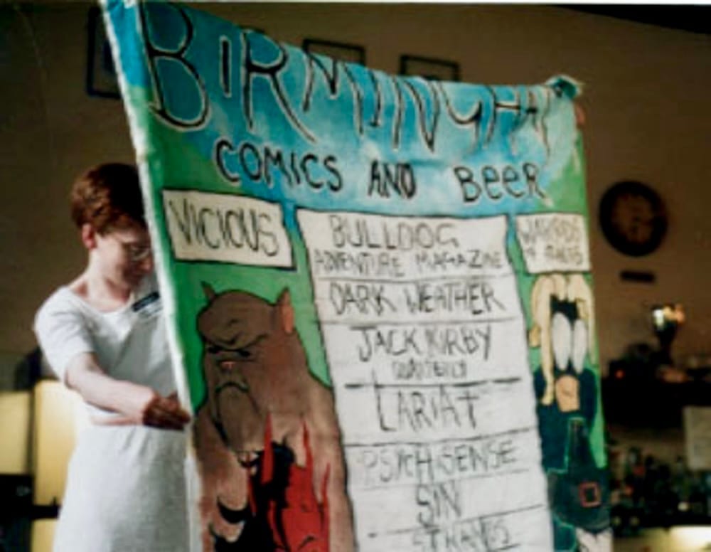- In March the Birmingham comics gang hire a bunch of tables at UKCAC and set up a base-camp there under a massive banner painted by Chris Askham.