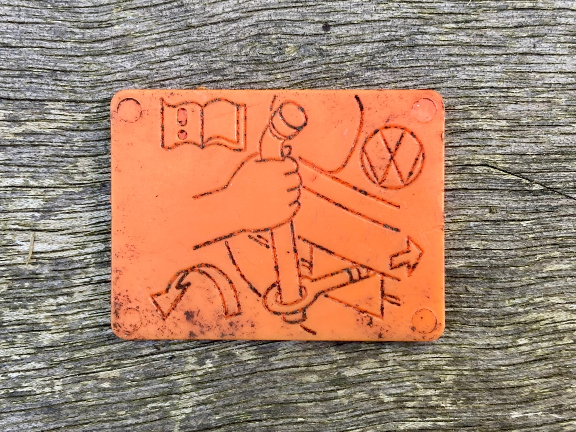 This is a perfect rectangle about 2mm thick and exactly 4cm x 3cm. The illustration is etched and has been inlayed with the compost. The back is completely smooth. While there are four circles in each corner there’s no sense of how it might be fixed to anything.