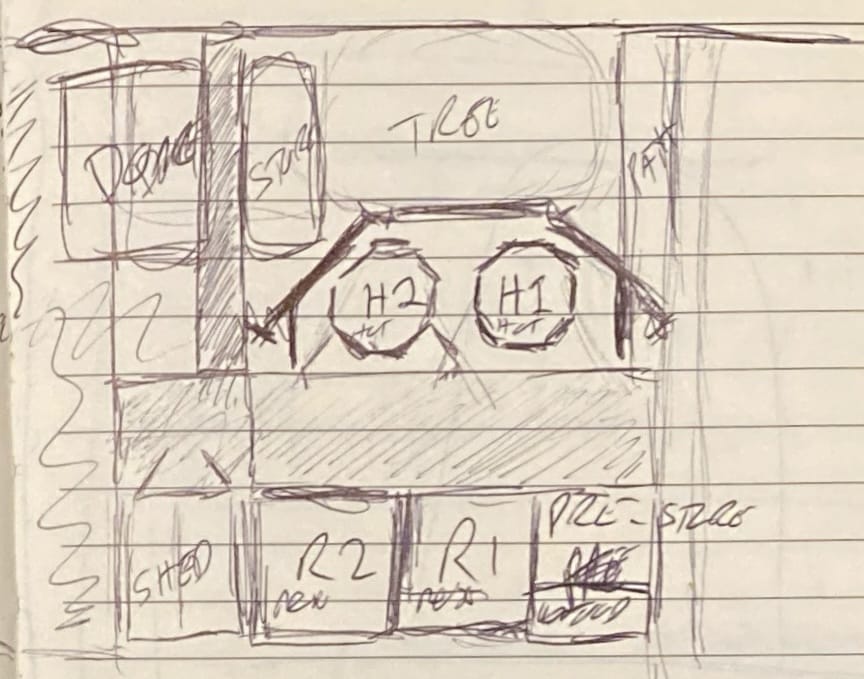 H1 and H2 are the hot composting bays, which will also be hexagonal bays, so the H is doing double duty there. (Maybe they should be H21 and H22. Something to ponder.) On either side are shading panels, salvaged from an old shed, for morning and evening while the tree will protect from midday sun.