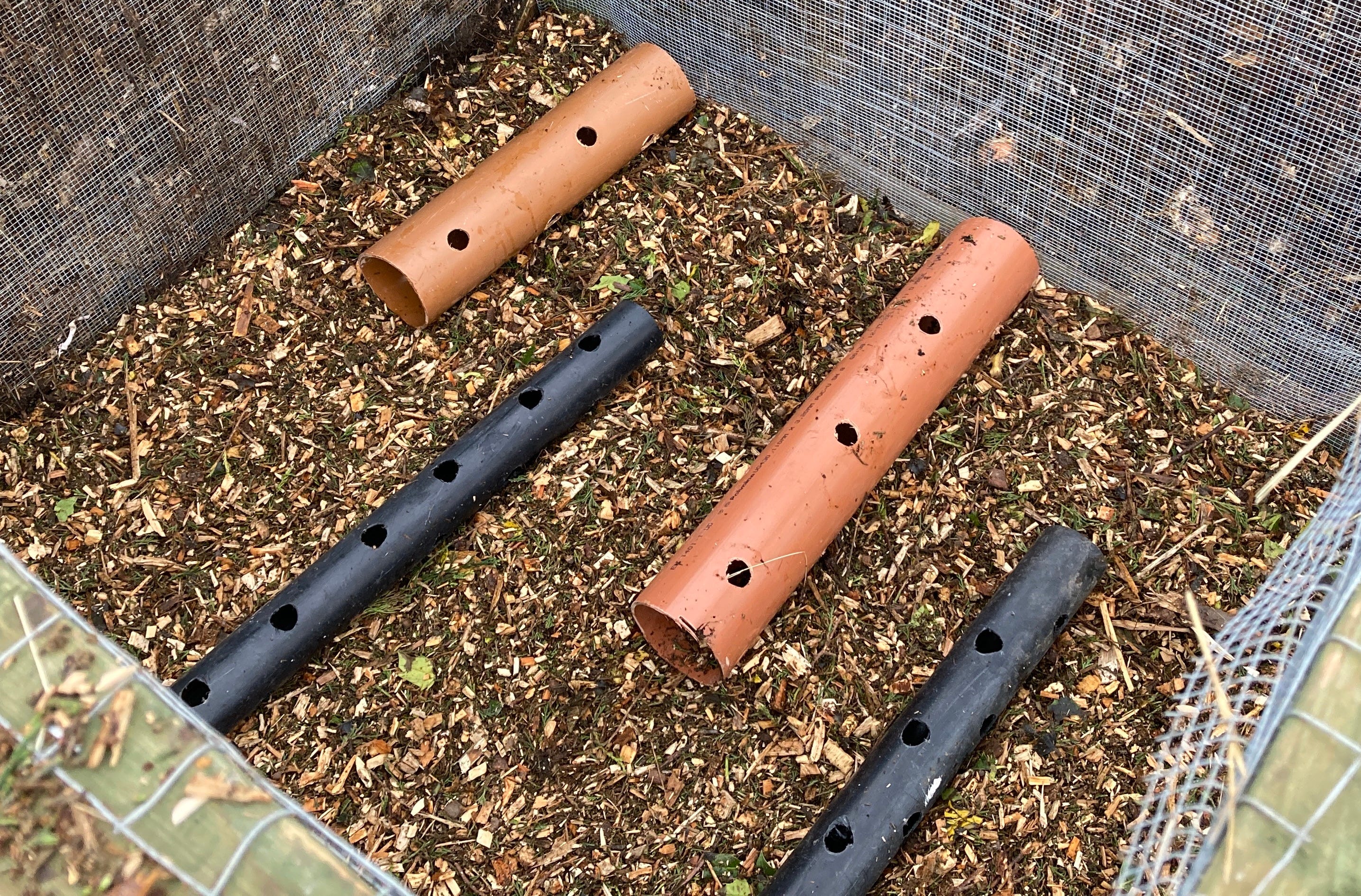 I start a fresh heap with a decent layer of wood chip into which I place three or four short pieces of drainpipe, about 60cm long, into which I’ve drilled a bunch holes. The pipes run from the side mesh of the heap structure to the middle, drawing fresh air into the core of the heap.